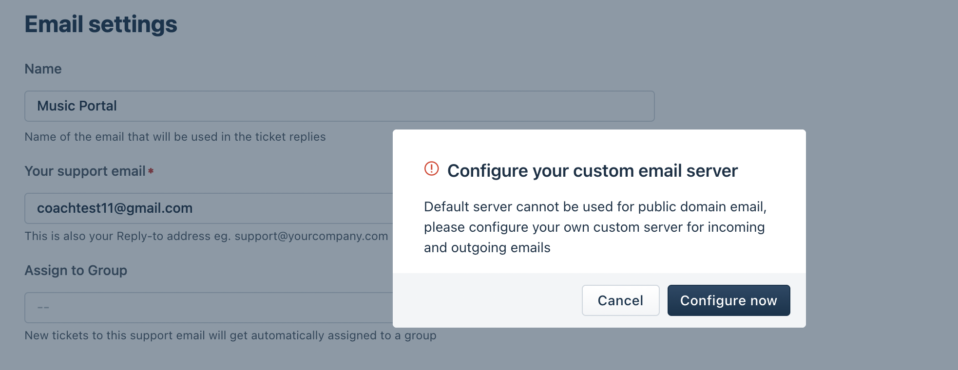 - We do not allow using the default Freshdesk server for public email domains(gmail.com, aol.com, outlook.com, etc.) due to DMARC enforcement by public domains as this leads to emails either getting dropped or may land up in spam.