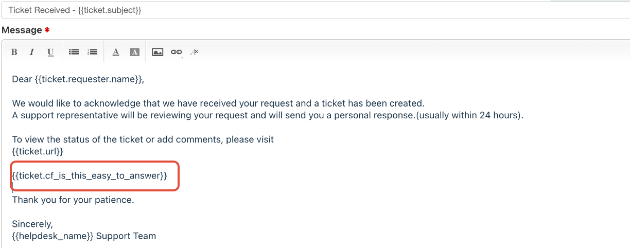 Example: In the below notification sample, is this easy to answer is a custom ticket field and at the time of ticket creation, if the field doesn't hold a value, then it will be returned blank.