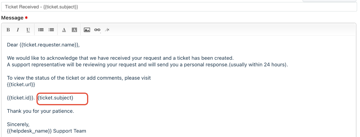 Placeholders can dynamically insert information such as the customer's name, ticket id, agent name, and more. For example, you can use the {{ticket. subject}} placeholder to automatically insert the subject of the ticket in an email notification.