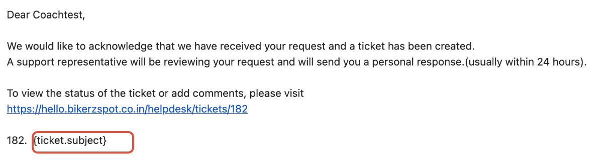 1. Placeholders returning blank: Placeholders are replaced with actual values when the email notification is triggered if the specific field holds a value. For example, if the customer has included a placeholder pertaining to a custom ticket field and if the field value is empty at the time of triggering the notification, then it will return blank.
