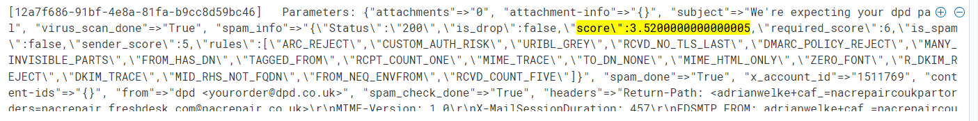 Check the "score\" section inside the Parameters, and it should not be more than 6 as shown below. If the score is >=6, then the ticket would automatically be marked as Spam.