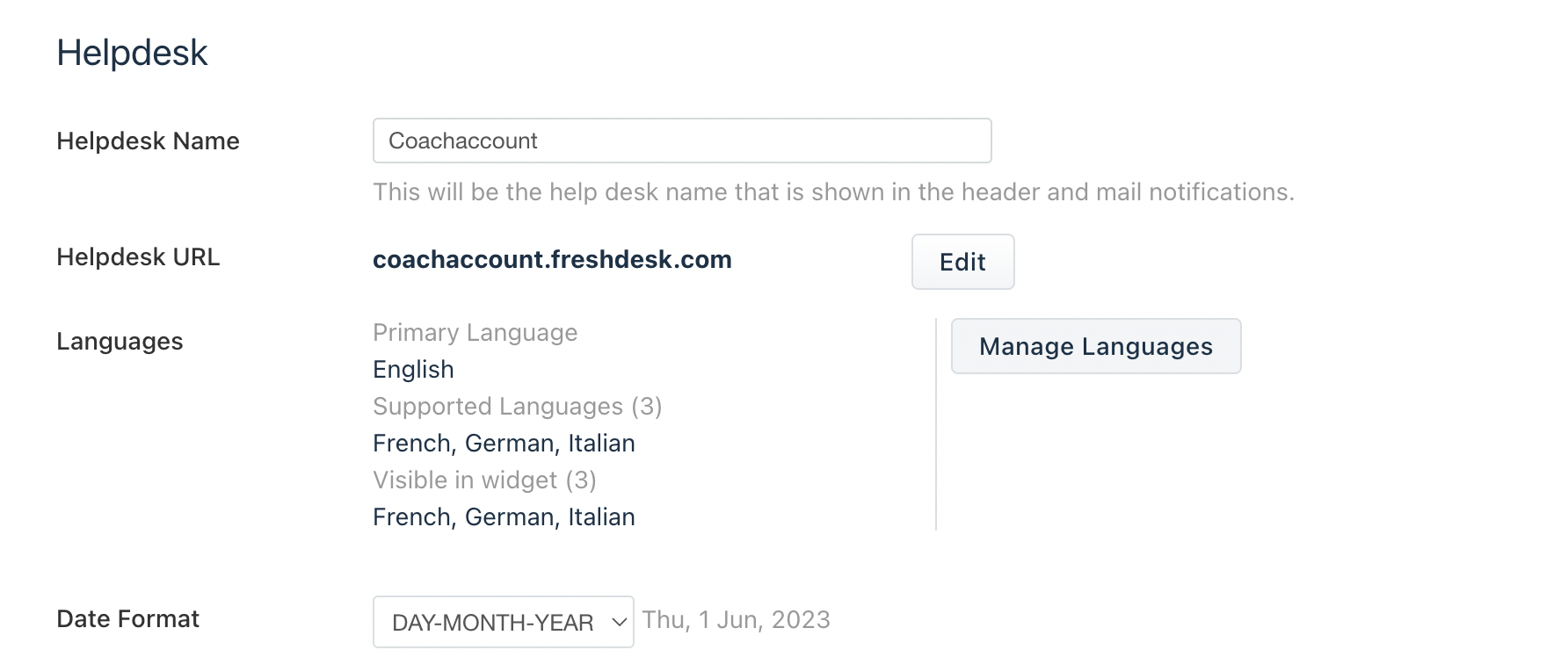- Click on Admin > Account > Helpdesk Settings > Manage Languages.