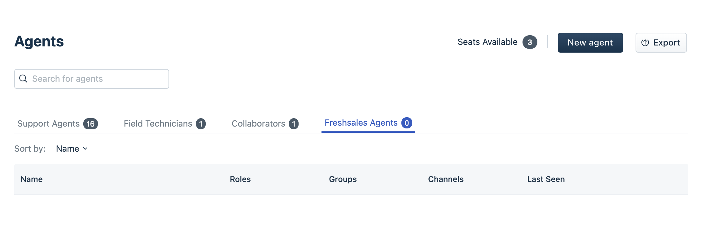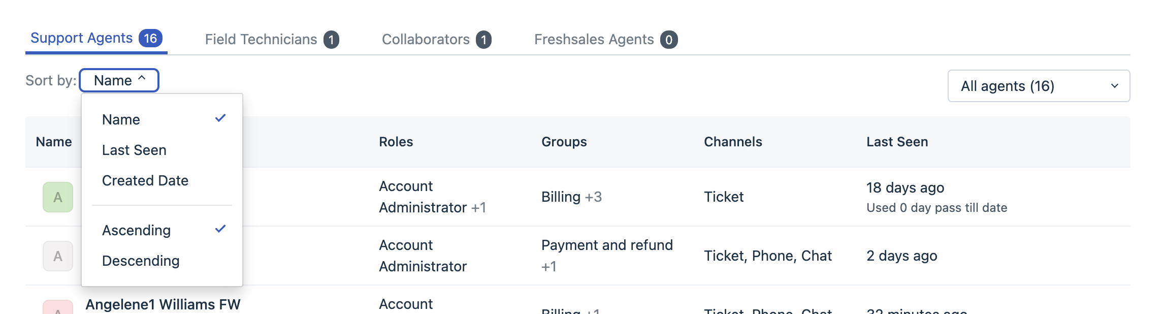 3. By default, the agent's name, email address, group, roles, scope and last seen are only displayed and this view cannot be customized.