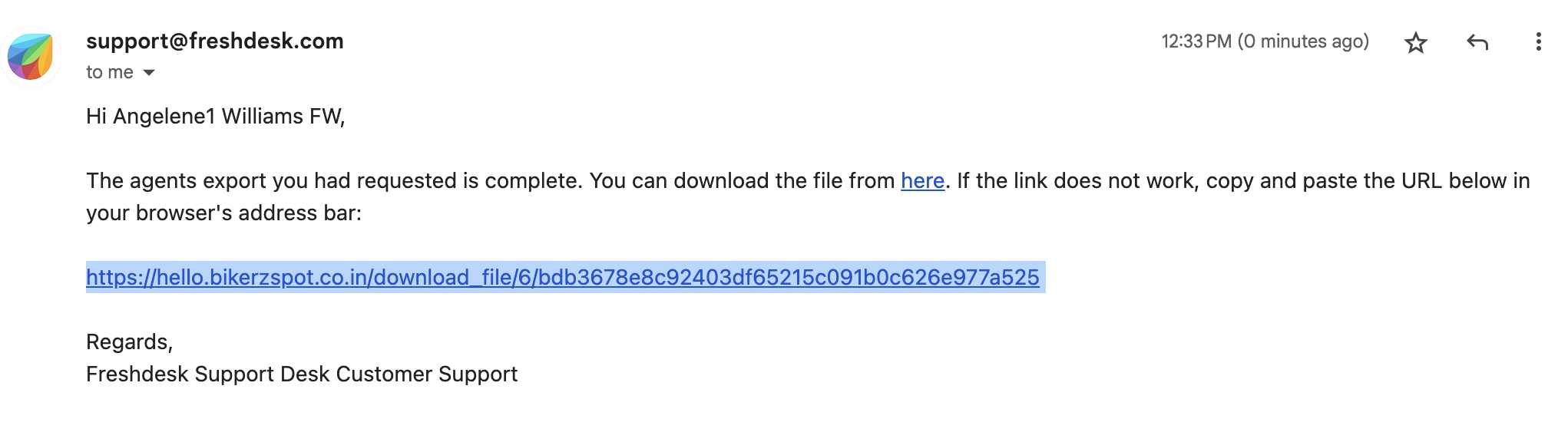 5. On clicking the export button, a link to download the file will be sent to the email address of the agent who initiated the request. On clicking the link, a CSV file will be downloaded.