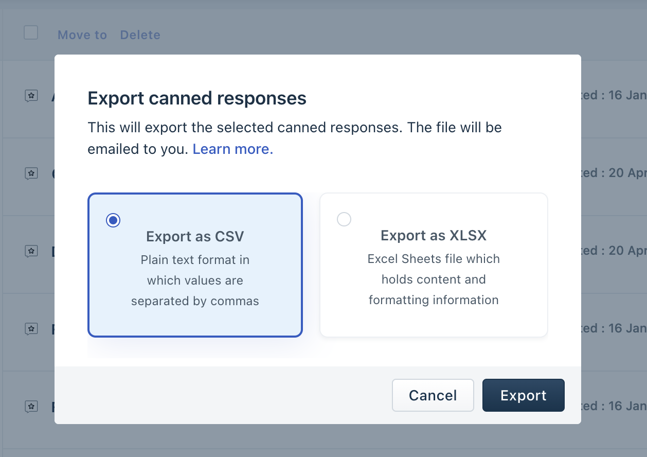 2. You can choose to export the canned responses either as a CSV or XLSX file. However please note that for import we allow only CSV files.