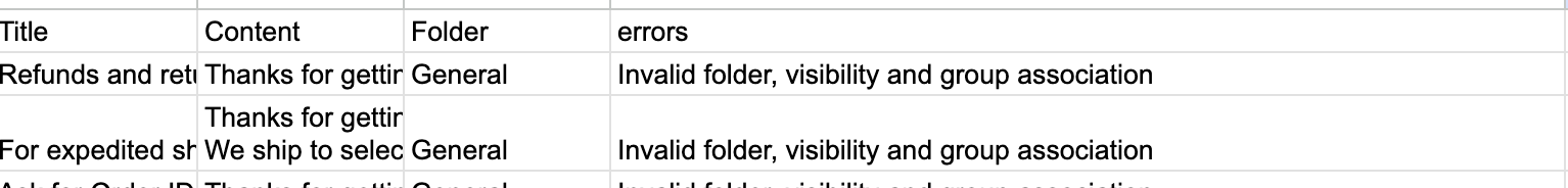 - If a folder name is mentioned in the canned response, then visibility is mandatory. If visibility is not mentioned, the import will fail for the reason - Invalid folder, visibility, and group association