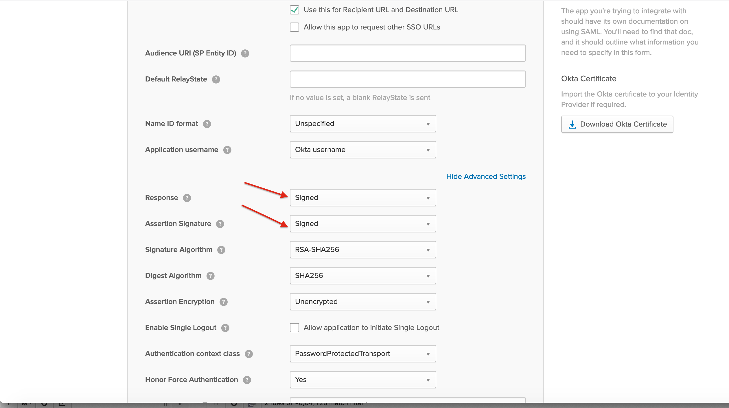 - Generic SAML app from Okta IDP is being used to set up SSO, then make sure Signed assertions and Signed Response are selected in the Okta SAML app.