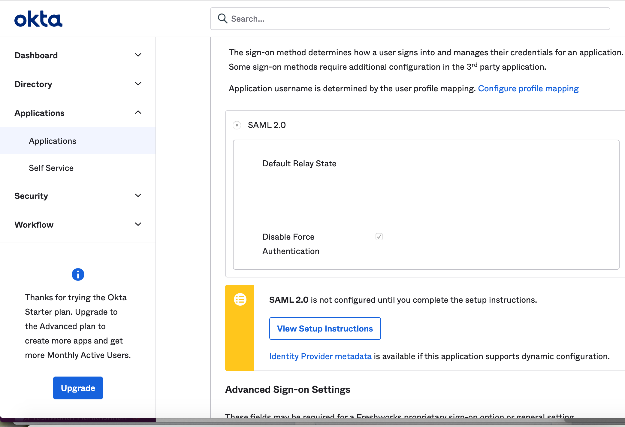 - Hence provide valid Entity ID copied from okta's Freshworks SAML app →Sign On→View Setup Instructions->Entity ID provided by the IdP and paste it in Freshworks Security →Okta(Using SAML) app's Entity ID provided by the IdP field.