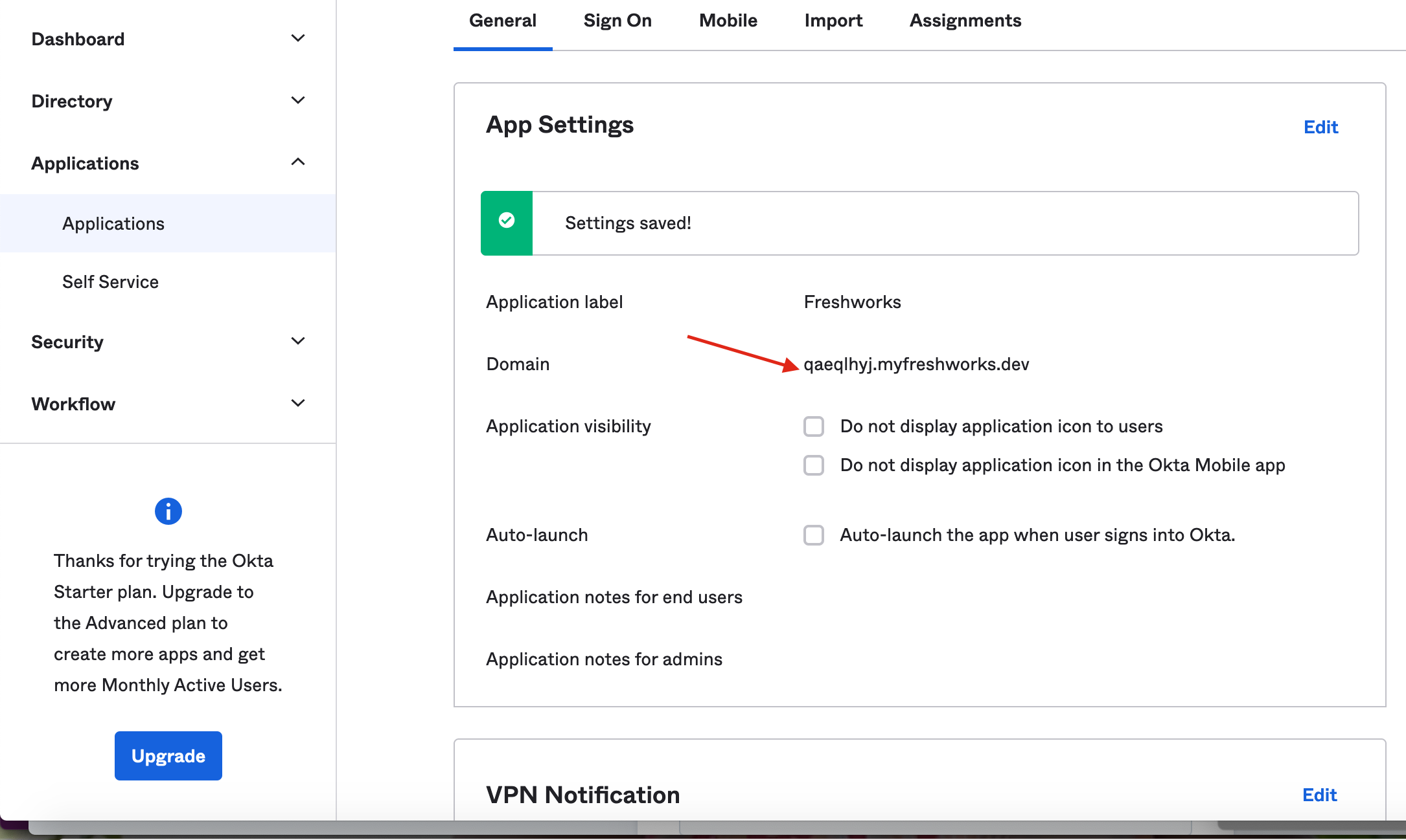 - At Okta IDP,if Freshworks SAML app is being used,then disable Single Logout option in Freshworks→Security -> Okta (using SAML).