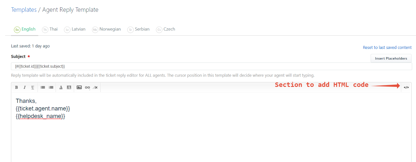If the customer has the HTML code of the signature, they can navigate to Admin>Workflows>Email Notifications>Template>Agent Reply Template. There will be an HTML icon on the top right corner of the content box where they can add the HTML code and save the changes. Adding a screenshot for reference: