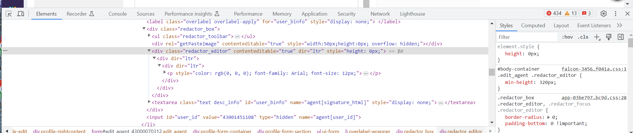 - Under the Elements tab, you will see a class with the name redactor_editor as in the below screenshot: