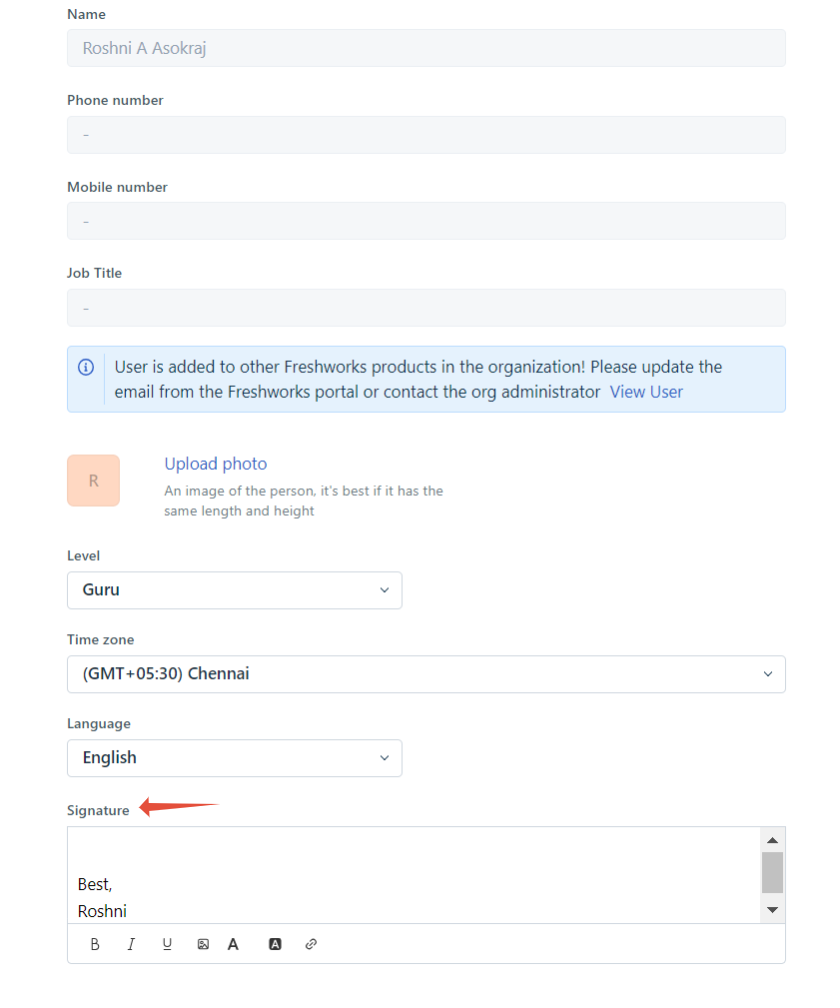To do this, the admin has to navigate to Admin>Team>Agents and click on the Edit option next to the agent whose signature has to be changed. Under the Signature section, they can configure the signature and click on the Update Agent option.