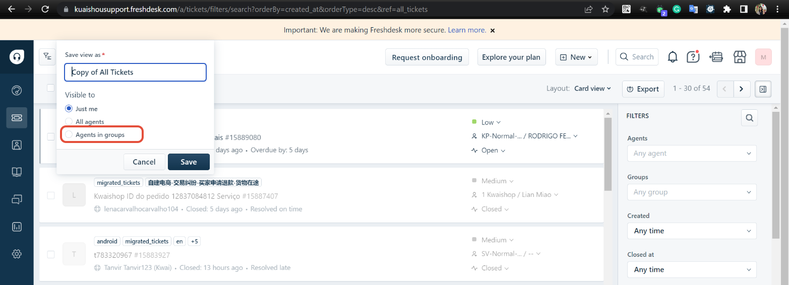 a) If the agent who is trying to access the view does not have sufficient permission to view it. For example: The visibility set for the view is "Agents in groups" and 2 groups are mapped to the view (Support, Sales). If the agent is not part of any of these groups, they will receive the error message.