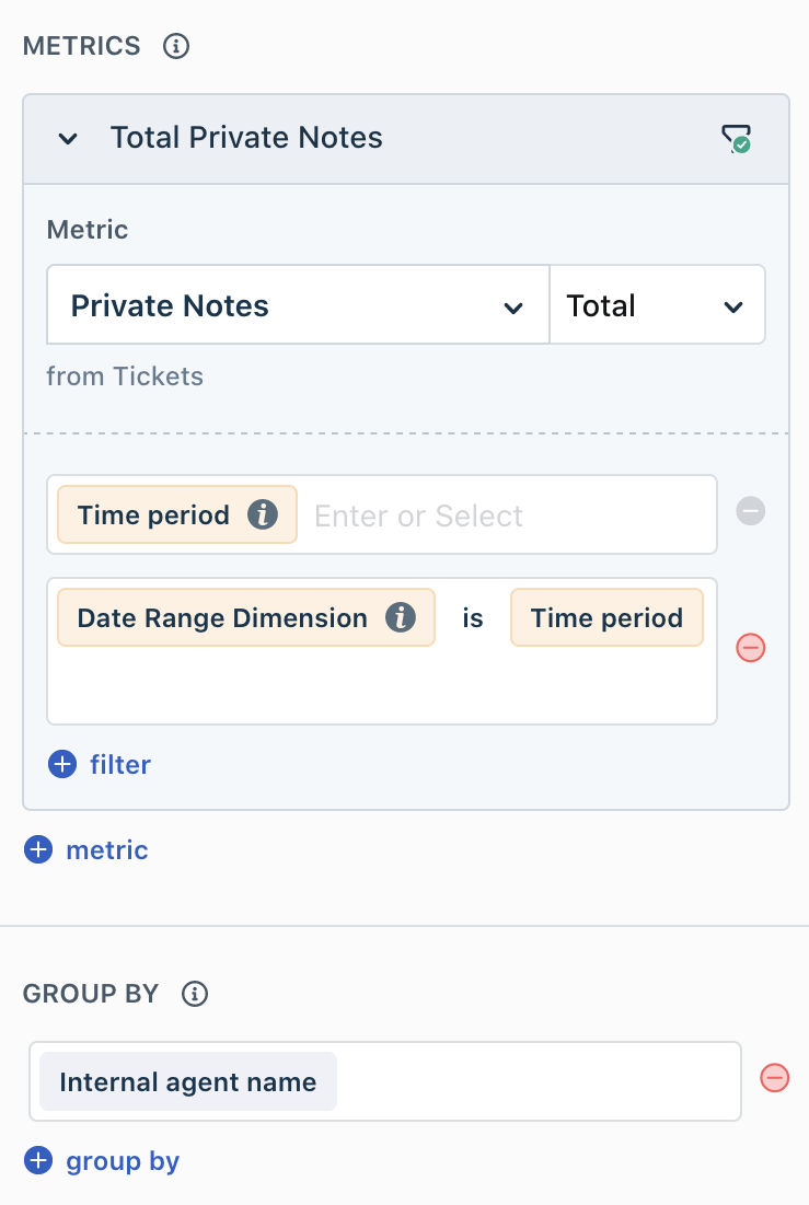 - Name the widget > click Next. On the right pane, click on metric and select 'Private Notes' from the dropdown. Now click group by and select Internal agent name from the dropdown.