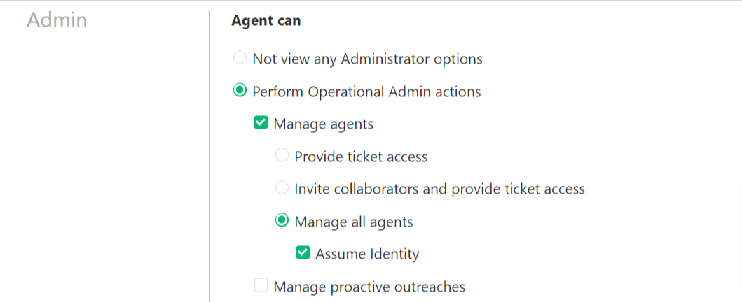 - If the agent has a custom role, navigate to the corresponding role under Admin > Roles to check if they have been granted any Admin privileges. If the custom role of an agent you are trying to assume has any admin operations enabled, you would not be able to assume their identity.