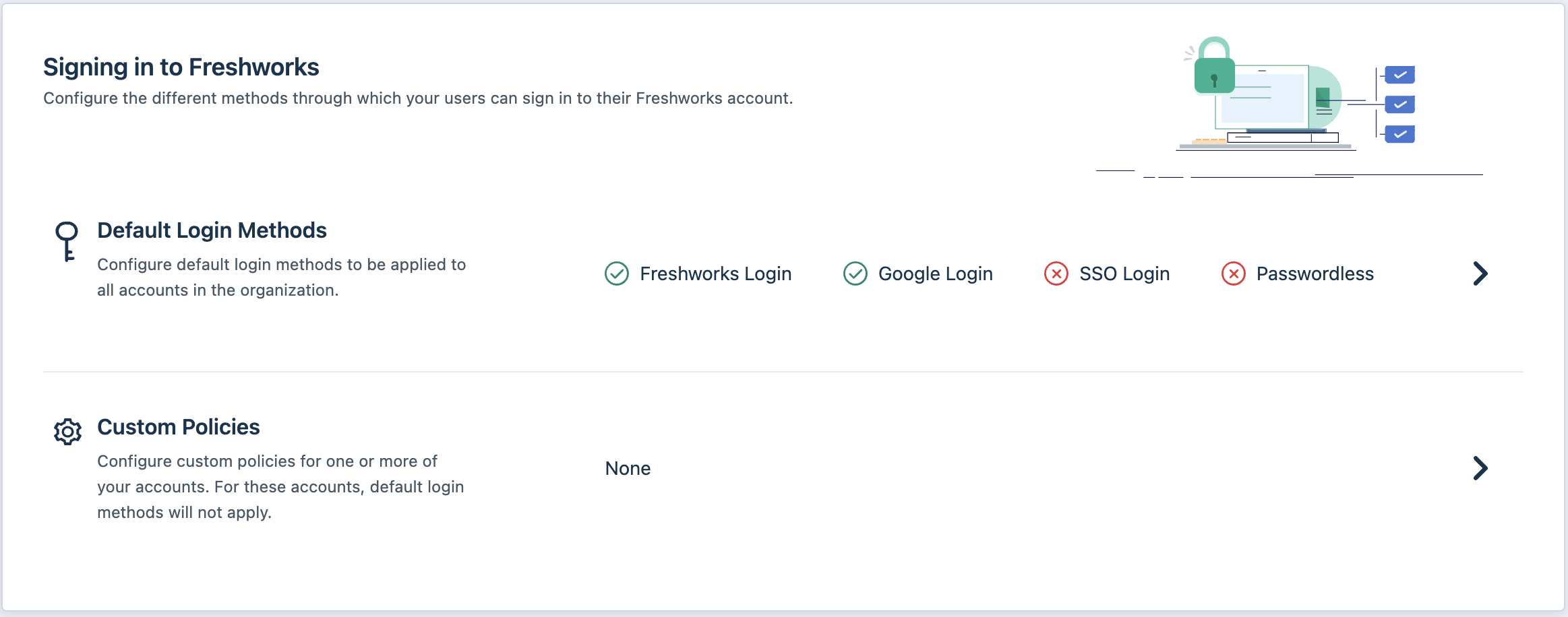 Org Admins can configure multiple policies that will ensure your users are securely accessing the Freshworks accounts. Here are a few things you can do: