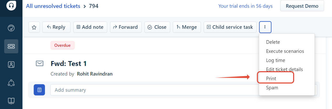 - You can make use of the print functionality on the ticket details page. Open the ticket > click on the three vertical dots > Print.
