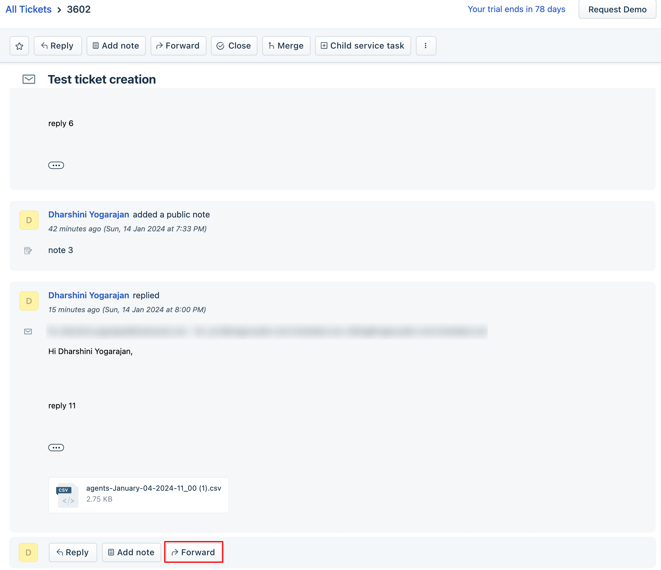 Additionally, each agent would have a forward button and the reply's latest four conversations will be forwarded by using this forward button. Having stated that, if the forward is sent via the ticket reply or from the bottom of the ticket, the maximum number of responses that can be included in the quoted text of the forward is 4.
