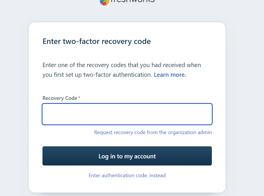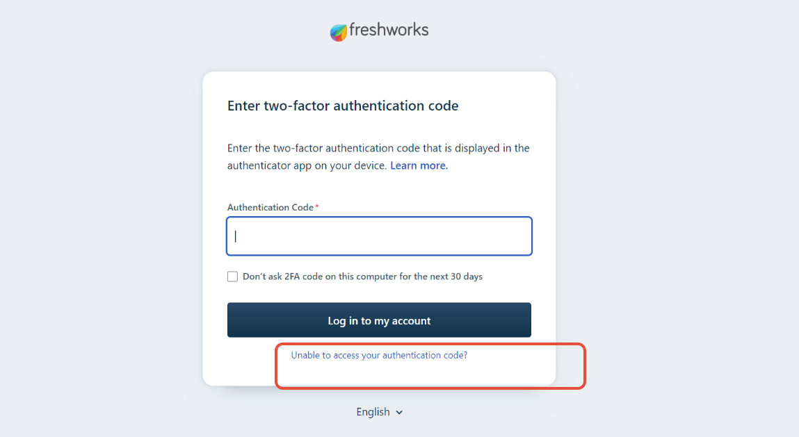 - If they are unable to access their mobile device for the 2FA code, check with the agent if they have access to the recovery codes provided while setting up 2FA. Make sure they click on "Unable to access your authentication code" and enter the recovery code on the next page.