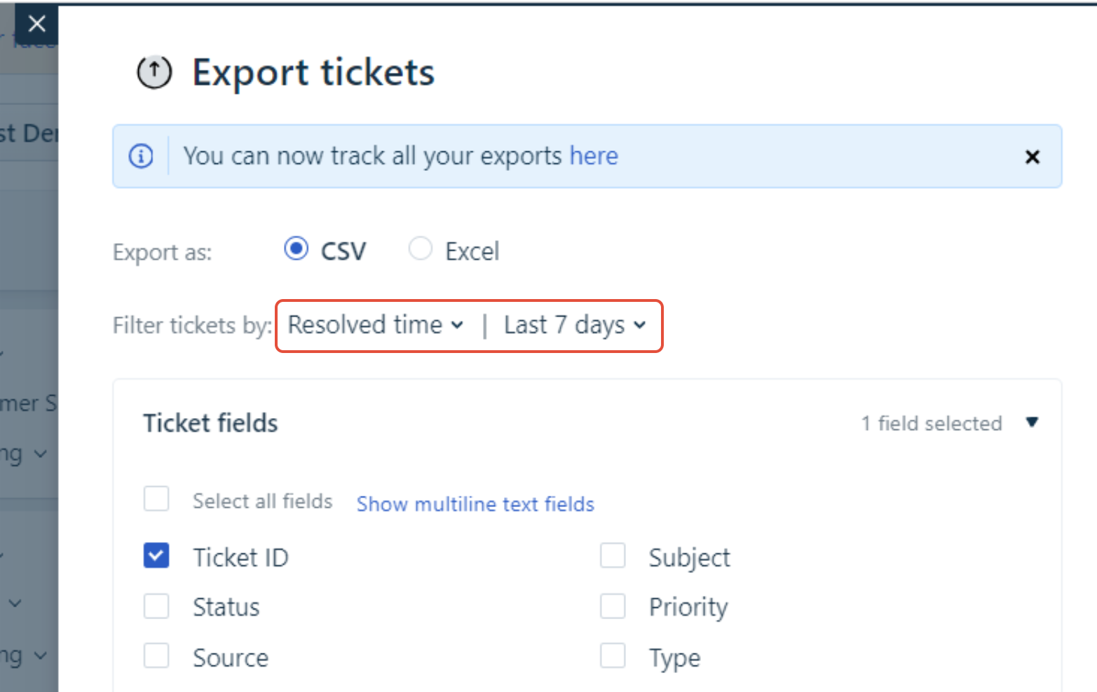 From the screenshots, we can see that "Anytime" is applied in the "Created" drop-down under the list view filters and "Last 7 days" in the Export tickets pop-up. Since there's a difference in the date range, the customer will see a difference in numbers. The date range and the metrics (Created, Closed at, Resolved at) that we are applying should be the same in the list view and in the Export tickets pop-up window.