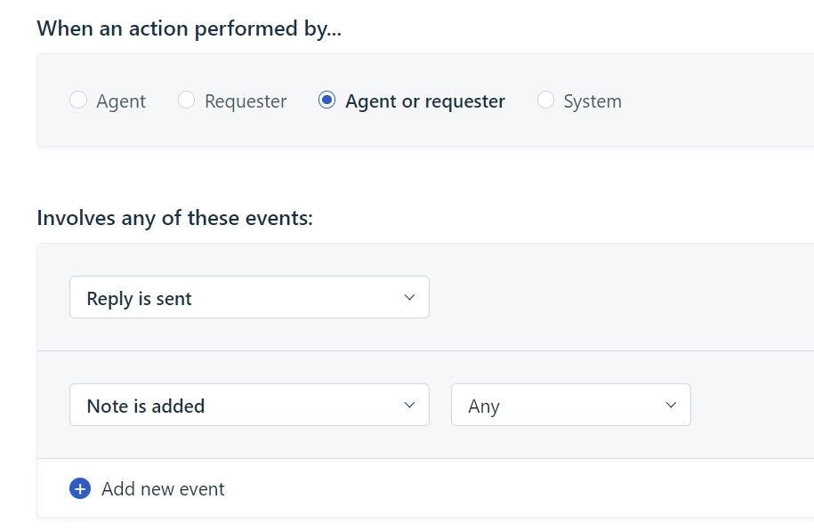 - Sometime's customer's might complain their automation rule did not reopen the ticket. In such cases, we can modify the automation rule to include the Event Performer as "Agent or Requester" and add the Event "Note is added" with "Any" or "Public" as an option according to the requirement.