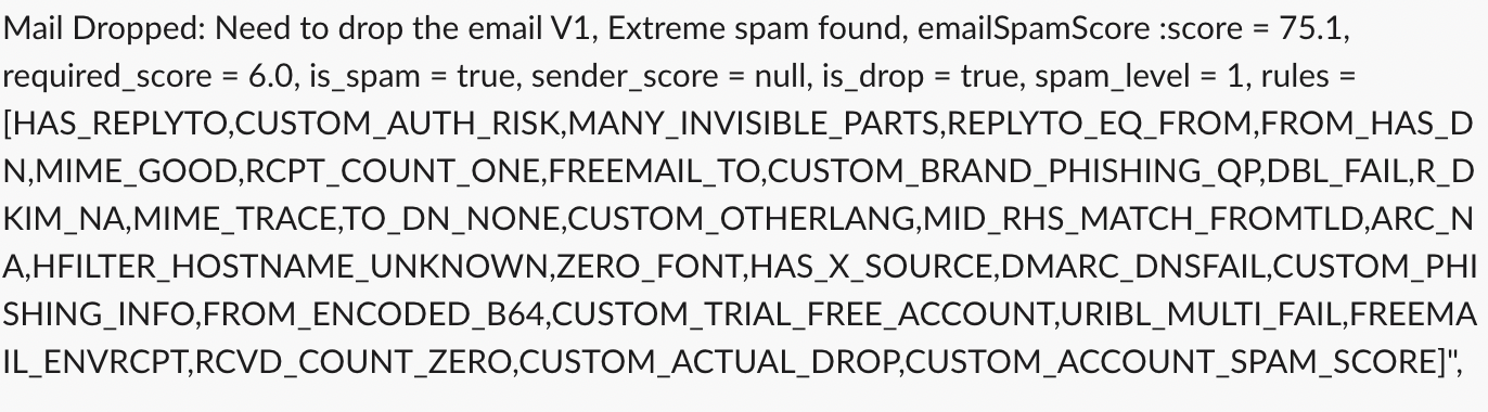 If the attachments for outgoing emails are found to be malware, then these emails aren't sent. They are dropped and an event is generated in Sumologic. Here's a sample response from Sumologic for an email that was dropped due to an attachment,