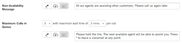 - If the number of callers exceed the limit you specify, or if the waiting time is exceeded, your callers will hear a non-availability message that you configure.