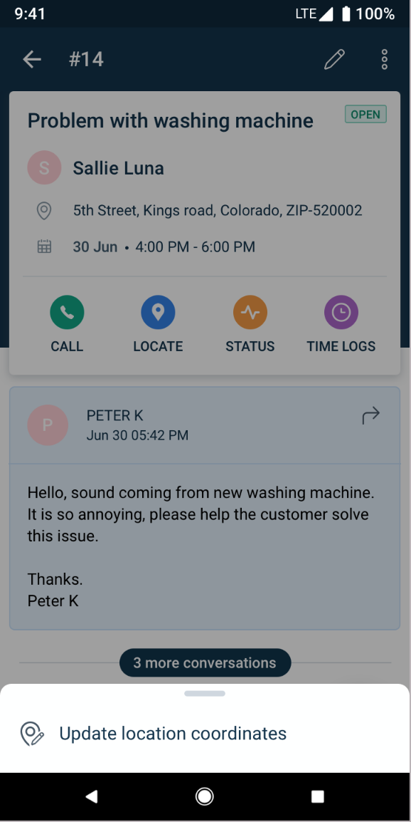 Once they are at the correct service location, field technicians can update the correct lat-long from the Freshdesk mobile app to prevent field technicians from getting incorrect directions in the future. Here are the steps to update the correct service location by dropping a pin on the map: