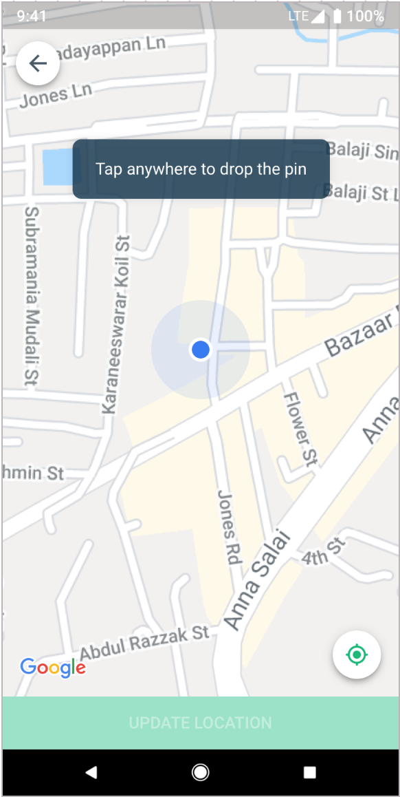 Since the current location is the right customer location, tap on the blue dot to drop a pin on the map.