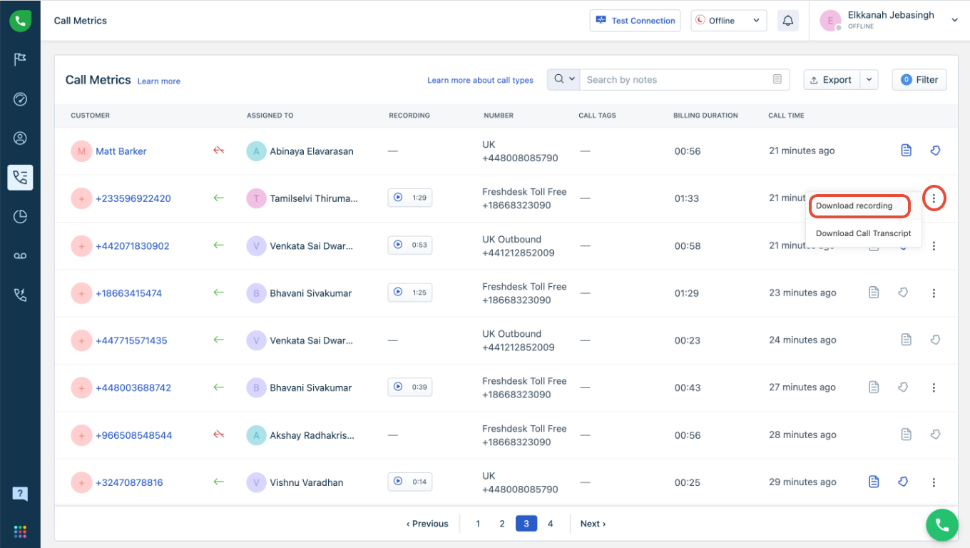 As an admin, you would be able to save the call recordings from Freshcaller Dashboard > Call Metrics > Download recording.
