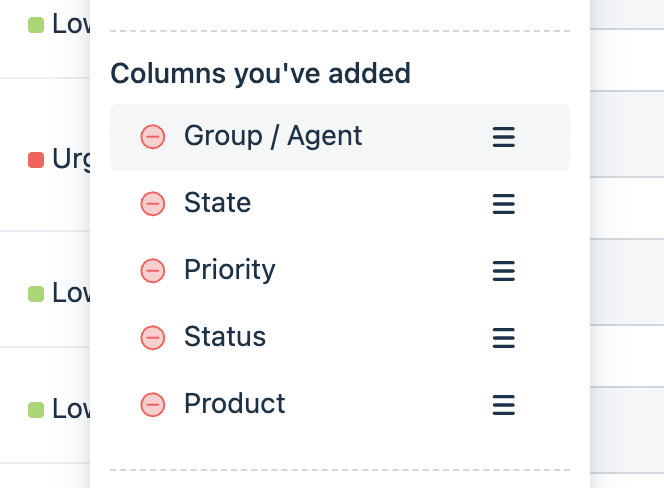 By default, the Table view will show the default properties such as Group name, Assigned agent, Priority, Status, State (Overdue, Customer responded, etc). This can be customised further clicking on the edit icon to the top right and choosing the fields of interest including custom fields as well. Apart from Contact and Subject which can't be removed, all other fields may be added or removed as per choice.