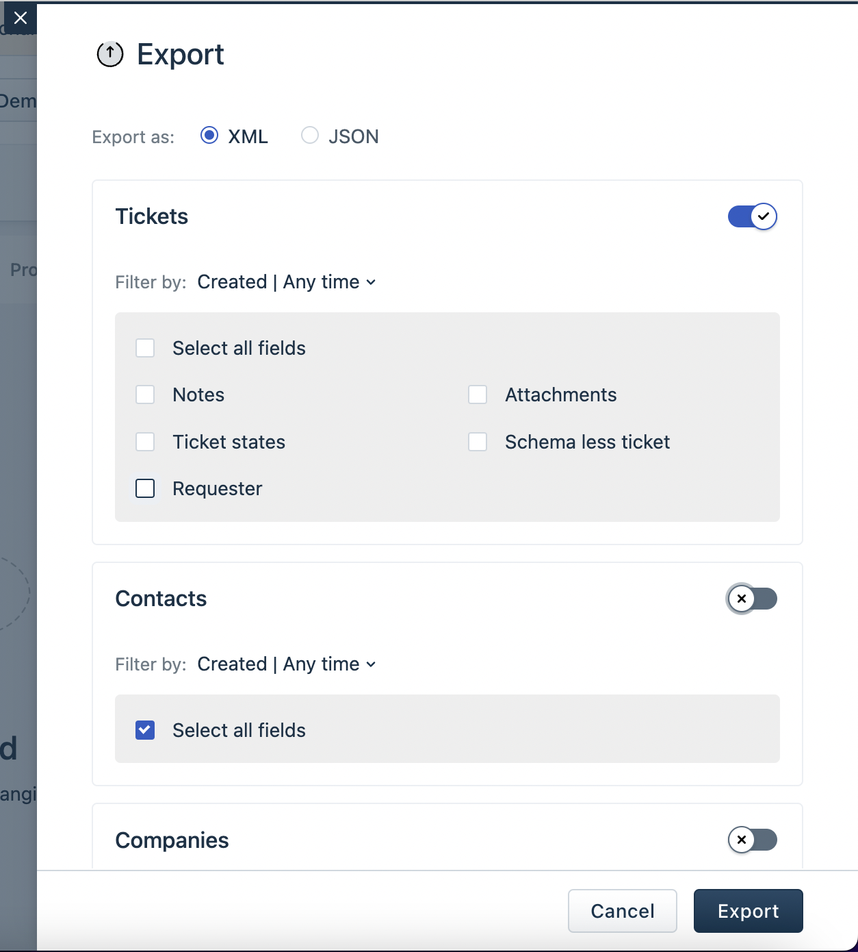 Clicking on the Details button will open a window displaying information about the export. This includes the selected time period, ticket fields, contact fields, company fields, and other relevant details.