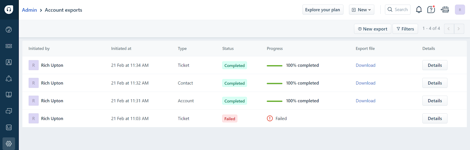 To access previously exported data from your helpdesk, go to Admin -> Account exports. Here, you can view the export history and track the progress of downloads. You also have the option to directly download the file from this page.