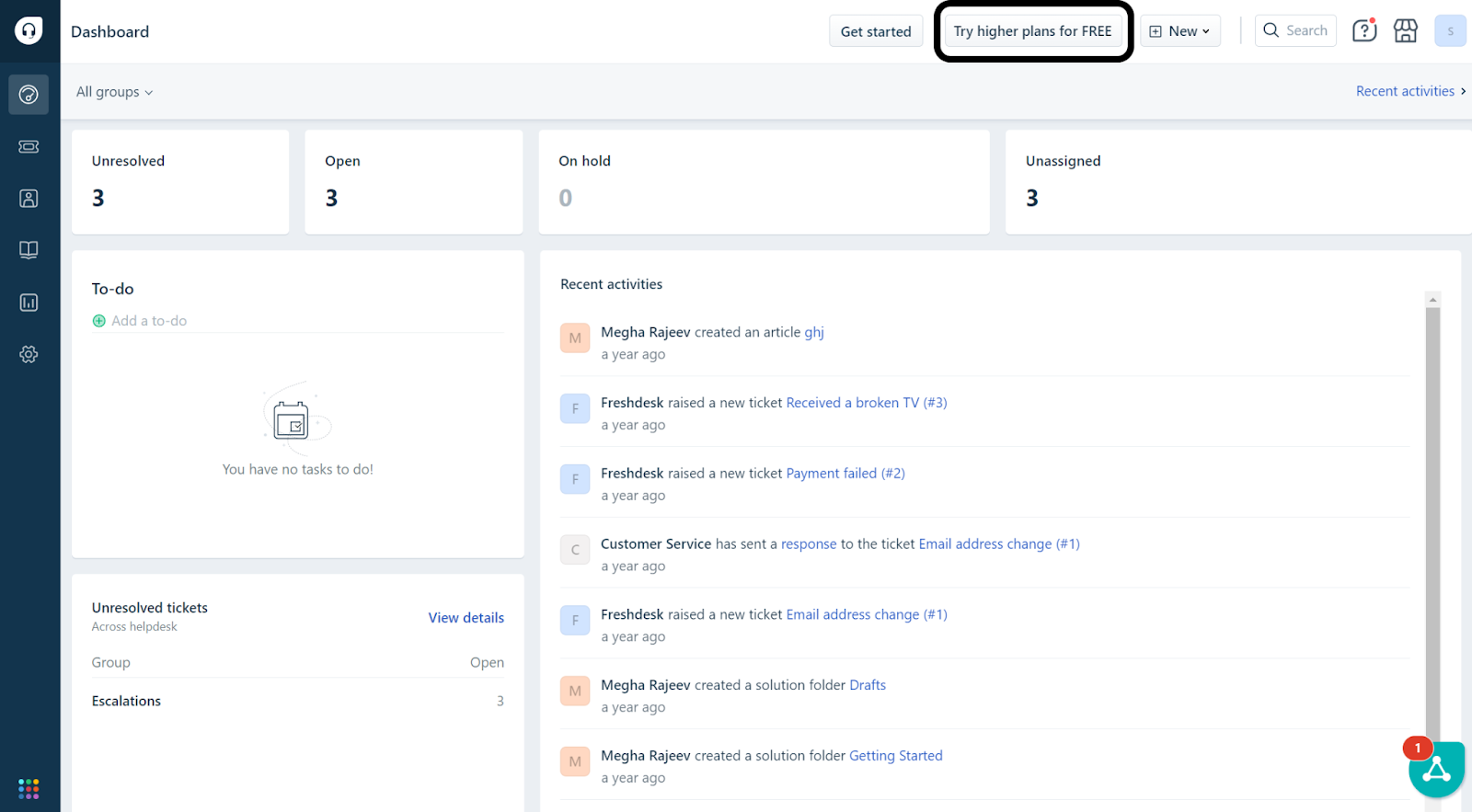 Click on ‘Try Higher Plan for Free’ on the top right of your Freshdesk account.