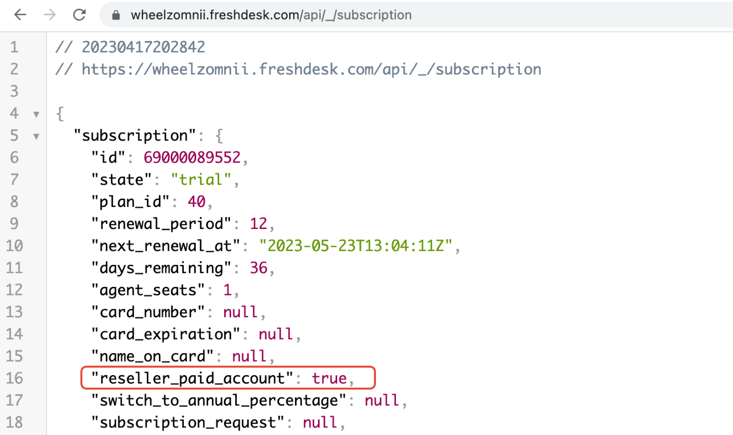 We can hit the endpoint https://domain.freshdesk.com/api/_/subscription using the OA access that has account admin privileges. If the reseller_paid_account is set to true it's a Reseller account.