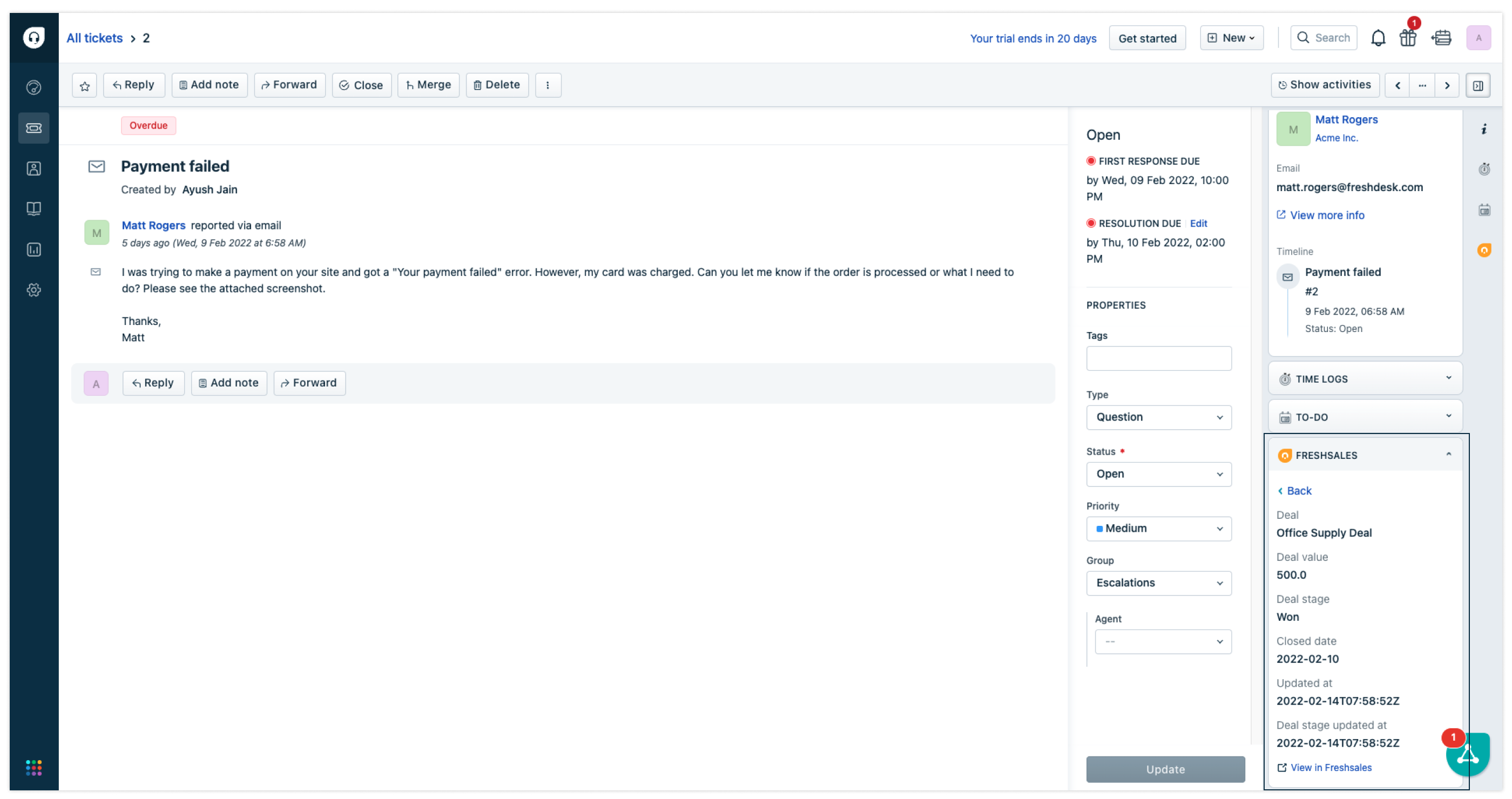 Note: If you wish to see Freshdesk tickets linked to contacts and leads in Freshsales, check out the Freshdesk integration in Freshsales.