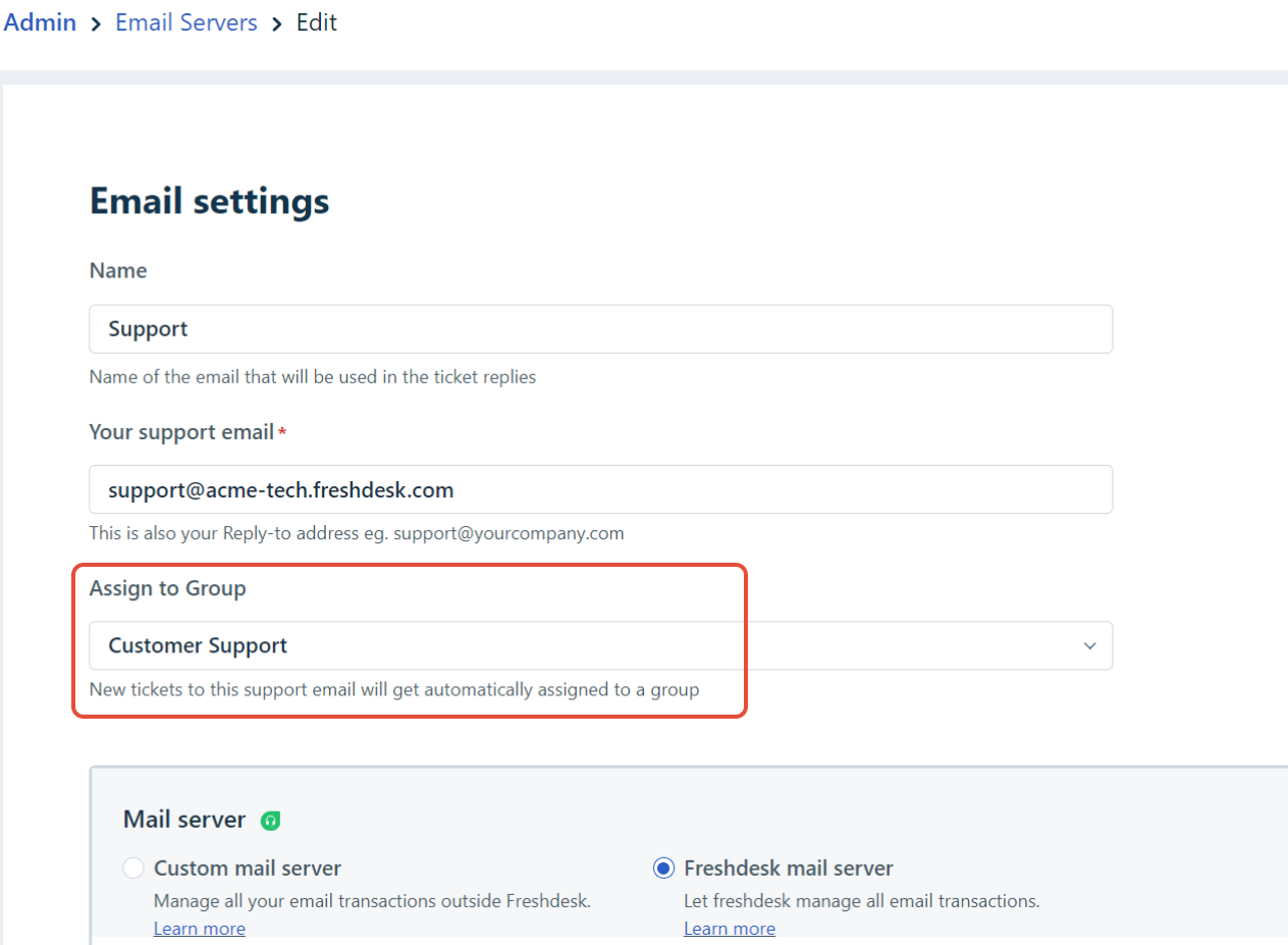 Custom mail server: You can also use custom email servers or public servers like Gmail or Microsoft to send and receive emails through Freshdesk. This lets you manage all your email transactions outside Freshdesk.